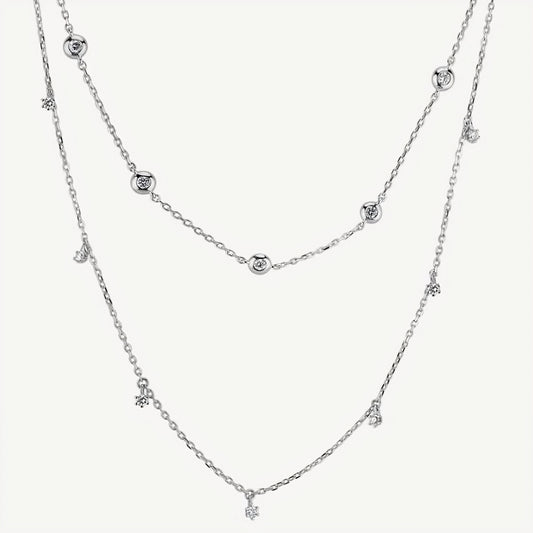 The minimalist QA necklaces are connected by a delicate chain made of white, yellow, and rose gold, with a subtle pendant or a symbolic talisman.